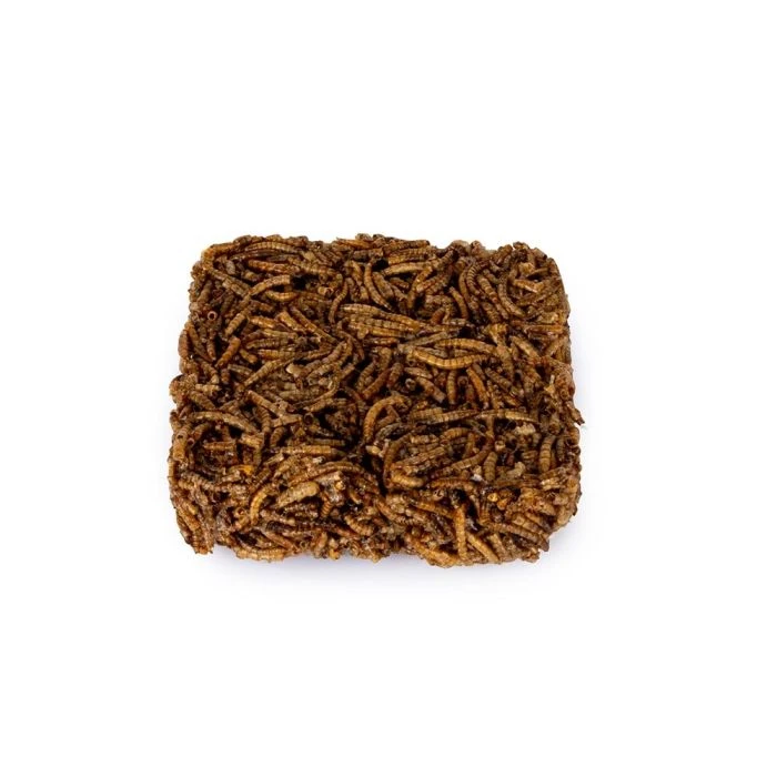 The dried mealworms are compressed into a handy block. The block fits in all our peanut cake feeders and hangers, but you can also put it on a feeding table.