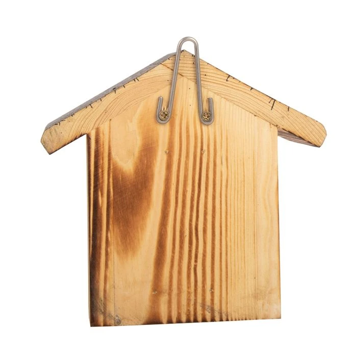 This nest box made from wood has an attractive flamed surface and complimentary black roof. The wood of this series of nesting boxes has been thermally modified by heating in an oxygen depleted environment at more than 180⁰C. This causes a chemical change in the structure of the wood that increases its durability and, we think, is also very attractive to look at. The lack of oxygen means the wood has been gently carbonised, giving a unique look to each box.